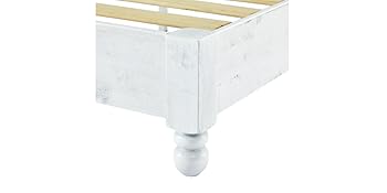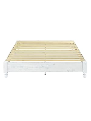 The MUSEHOMEINC Solid Wood Platform Bed Frame in Queen size features a durable 57.3-pound solid wood construction with 12 high-quality wooden slats that eliminate the need for a boxspring. Its white washed finish and gourd-shaped legs blend rustic and contemporary styles, while a squeak-resistant design ensures quiet, stable support. Easy to assemble with all parts included, this bed frame offers both style and functionality for a sophisticated bedroom upgrade.