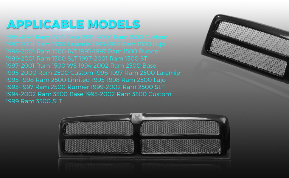 | Special Features | 5EZ51RX8 CH1200188 2002 2001 2000 1999 1998 1997 1996 1995 1994 Compatible With Dodge Ram 1500 2500 3500 Excludes Sport Package Standard Cab Pickup Extended Cab Pickup Crew Cab Pickup Cab & Chassis 8Cyl 6Cyl 10Cyl 5.9L 5.2L 3.9L 8.0L Base ST WS Laramie Grille Grill |