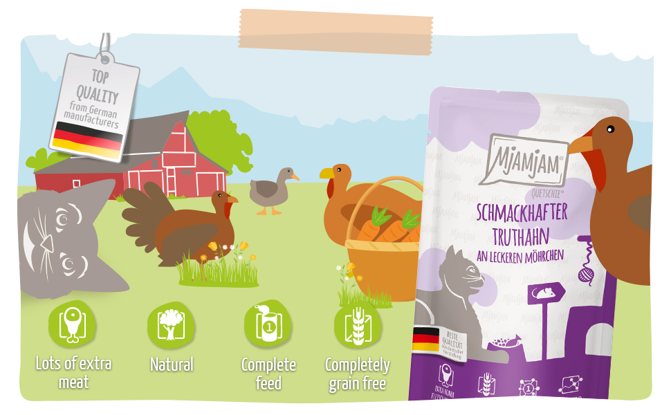 MjAMjAM Quetschie is a premium wet cat food featuring 94% turkey meat and offal, enriched with natural carrots and essential nutrients. Grain-free and free from gluten, sugar, lactose, and synthetic preservatives, it’s crafted from regional farm ingredients to support cats of all breeds and life stages with a wholesome, tasty, and allergen-conscious diet.