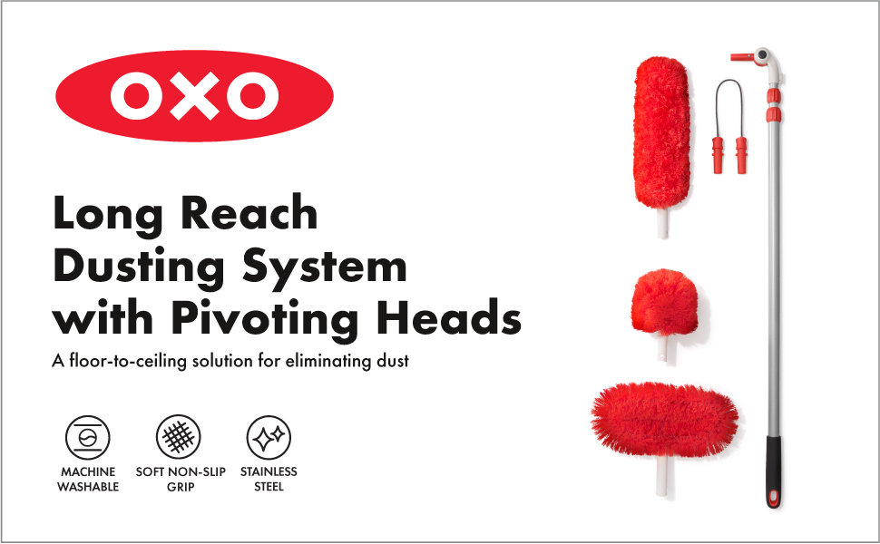 The OXO Good Grips Long Reach Dusting System features a sturdy, extendable pole that reaches up to 8 feet, making it perfect for cleaning high ceilings and hard-to-reach areas. With three interchangeable heads that pivot over 225 degrees, this system is designed for versatility and ease of use. The microfiber head is machine washable, ensuring a sustainable cleaning solution, while the compact design allows for easy storage.