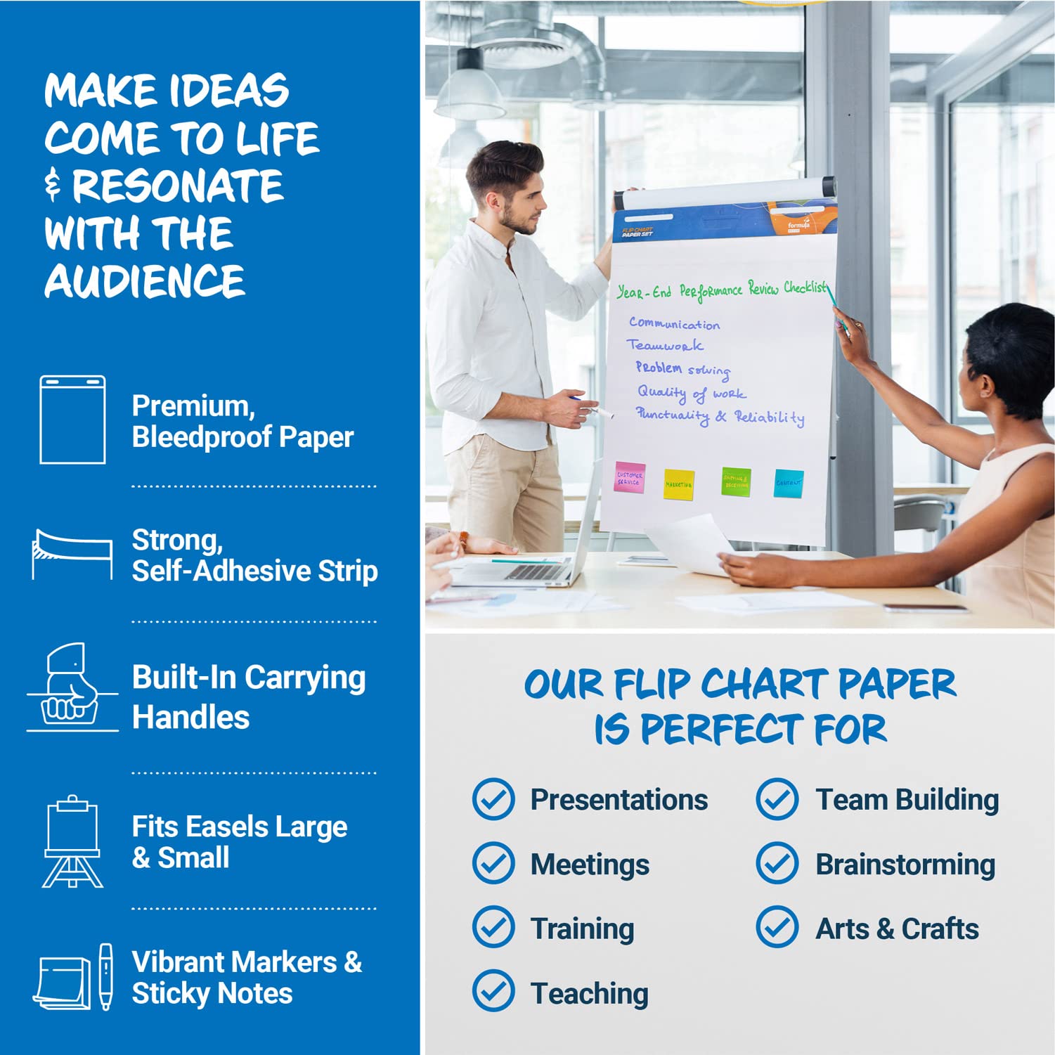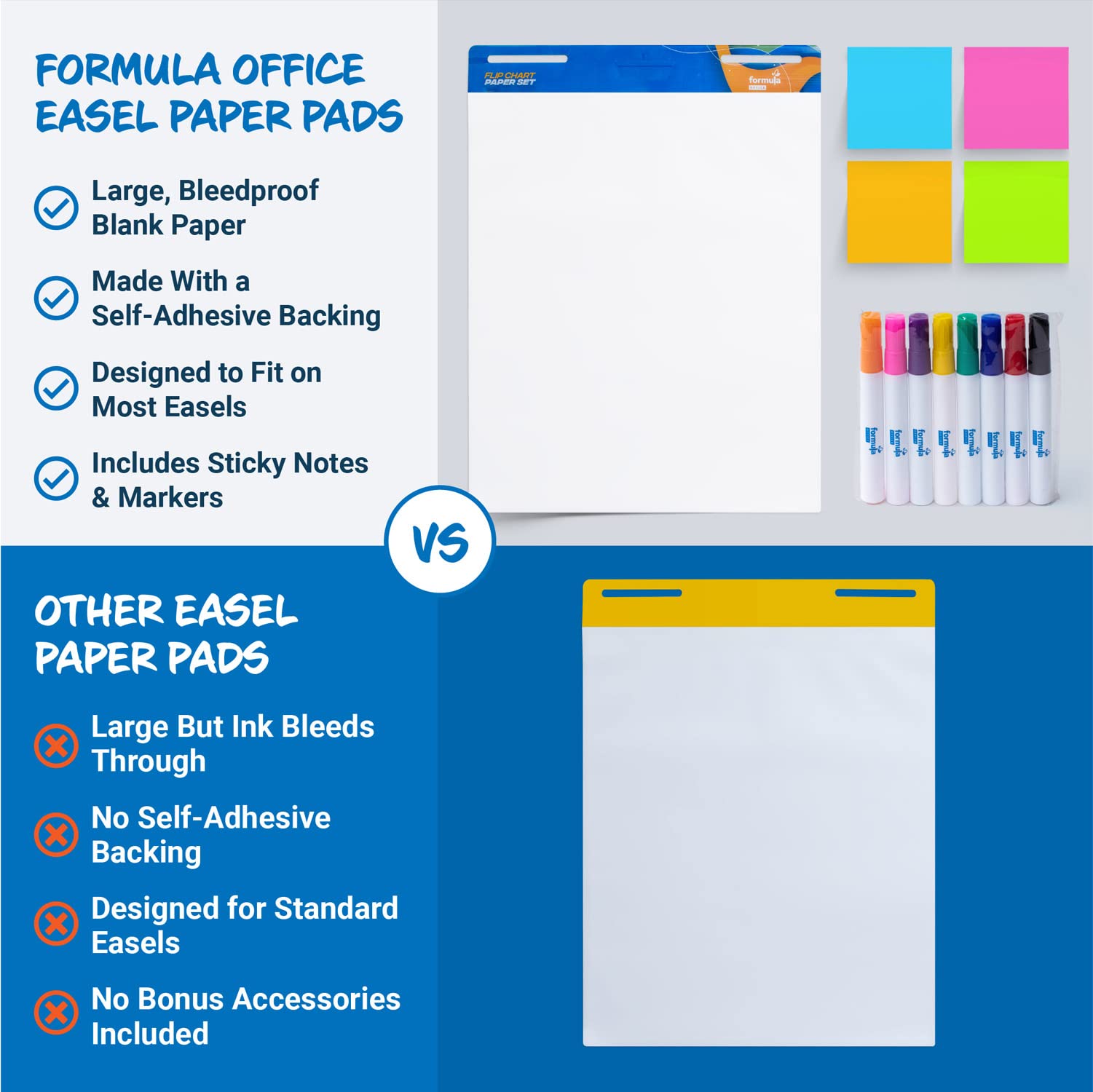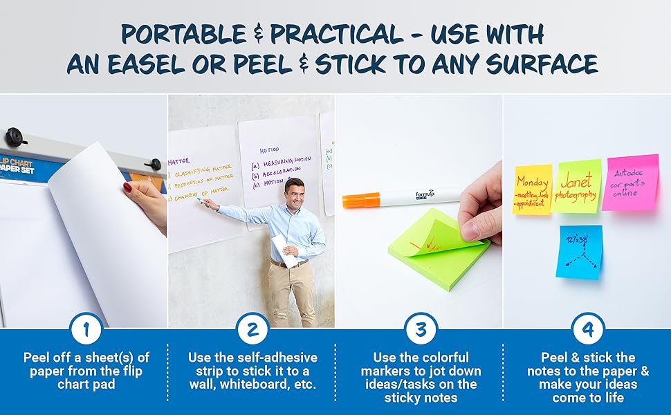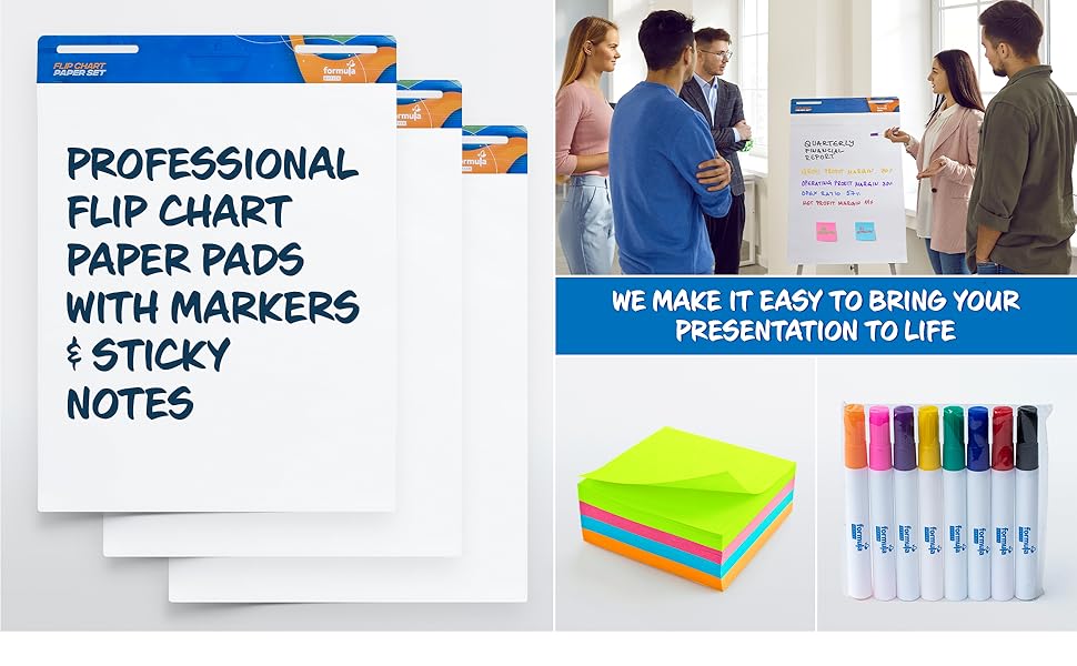 I use flip charts for live and recorded presentations. The problem is that a lot of them are really badly made for some reason with thin paper or pages sticking together, etc. The formula office flip chart is by far the best quality you can get. The paper feels like its not going to rip on you randomly, the pages dont stick, the adhesion at the top is the right strength. In general it just feels high quality. It honestly really made a difference in my presentationsThis kit was actually perfect for me as well as it comes with really good markers with the right thickness to be read far away while not being to thick to be articulate in writings and drawings. The sticky pads I found very very useful as well. I will be getting exclusively Formula Office pads for myself and my coworkers going forward.