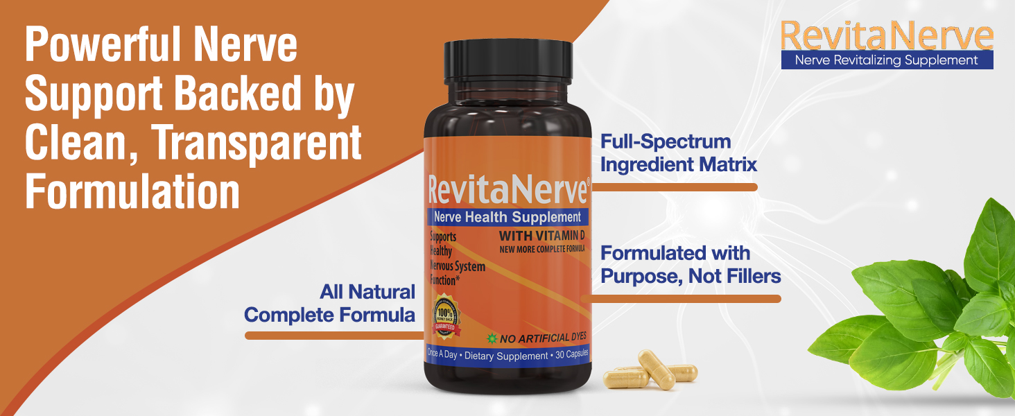 RevitaNerve is a clinically formulated nerve support supplement designed to alleviate discomfort and promote healthy nerve function. With a once-a-day capsule containing essential vitamins and natural ingredients, it aims to enhance circulation and overall nerve health, empowering you to live an active and fulfilling life.