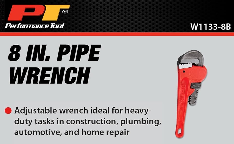 The PERFORMANCE TOOL W1133-8B 8-Inch Pipe Wrench is a robust tool designed for both professionals and DIY enthusiasts. With a jaw capacity of 1 inch and made from precision milled drop forged steel, it offers exceptional durability and grip. Weighing only 340g, it combines lightweight handling with heavy-duty performance, all wrapped in a stylish, protective enamel finish.