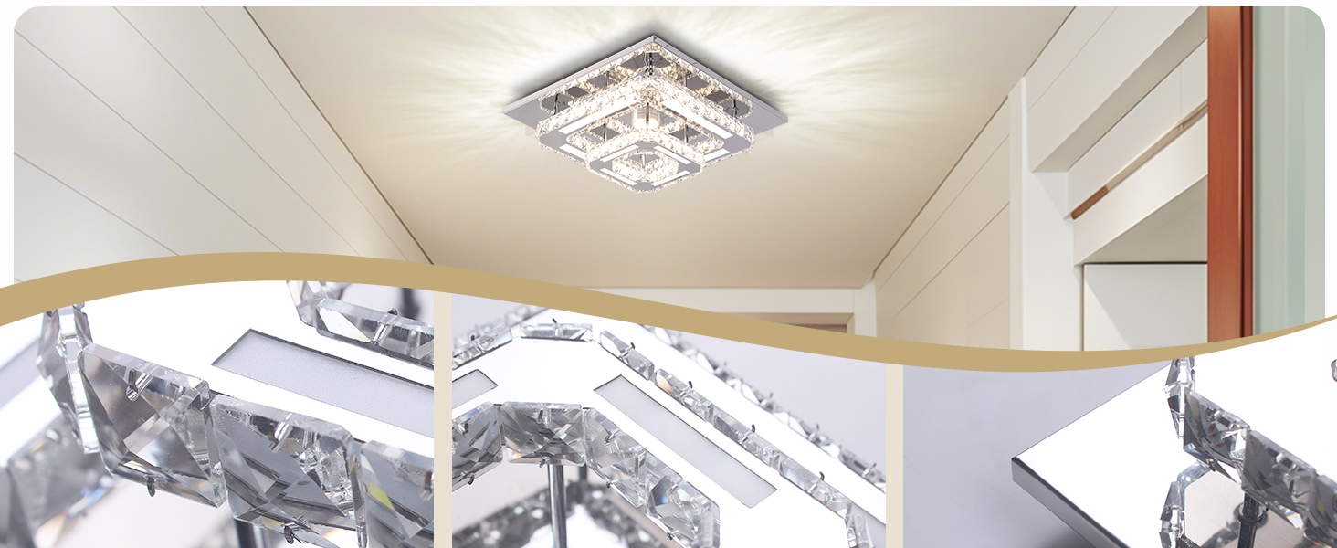 The CXGLEAMING 11.8" Modern Crystal Chandelier combines premium K9 crystals and stainless steel with a powerful 29W LED panel delivering 4800 lumens. Fully dimmable and color temperature adjustable via remote control, it offers customizable lighting from warm to cool tones. Its compact square design fits flush to ceilings, ideal for modern living rooms, bedrooms, and hallways. Energy-efficient and easy to install, this chandelier brings luxury and smart lighting to your home.