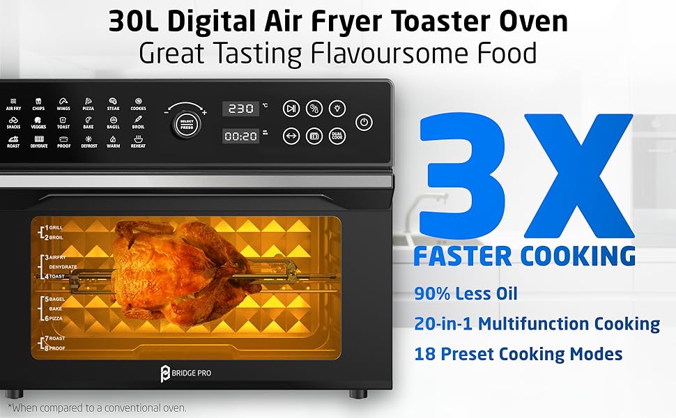 The Bridge Pro 30L Air Fryer Oven combines powerful 1800W heating with a large 30-litre capacity and 20 versatile cooking modes. Featuring smart dual cook technology and 360° hot air circulation, it delivers faster, healthier meals with precision temperature and time control via a digital touch screen and smart dial. Complete with 7 essential accessories and energy-efficient design, it’s the ultimate all-in-one appliance for busy families seeking convenience without compromise.