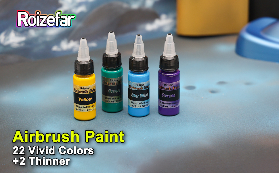 Roizefar Airbrush Paint Set offers 22 vivid acrylic colors including neon and metallic finishes, paired with 2 thinners for perfect flow control. Water-based and easy to clean, this 20ml per bottle kit is designed for smooth, clog-free spraying on multiple surfaces like fabric, wood, metal, and ceramics—ideal for artists, students, and professionals seeking versatile, high-quality airbrush paints.