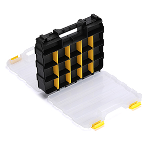 The CASOMAN Double Side Tool Organizer is a robust, 34-compartment storage solution made from impact-resistant polypropylene. Featuring 30 removable dividers and 4 fixed sections, it offers fully customizable organization for screws, nuts, and small parts. Its transparent lids and secure dual latches provide quick visibility and safe transport, all wrapped in a sleek black, yellow, and clear design perfect for professionals on the go.