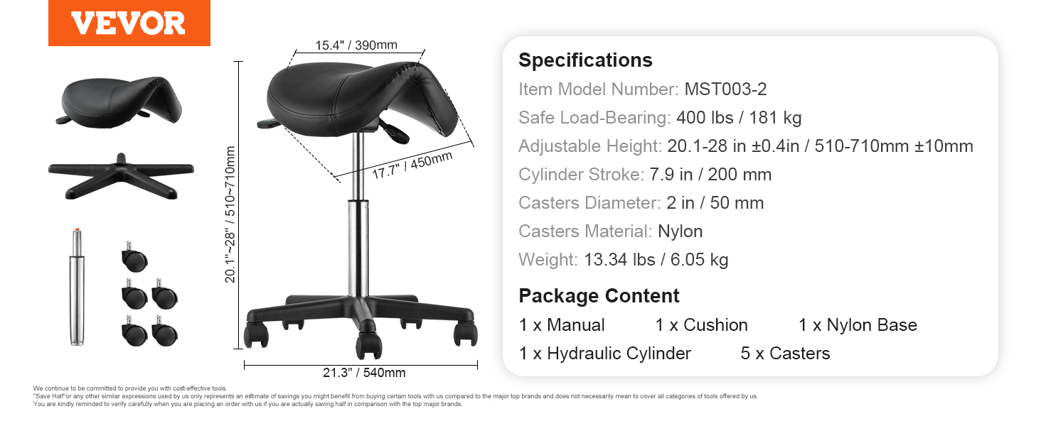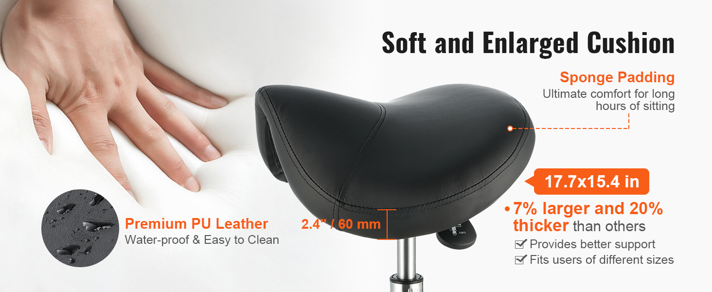 The VEVOR Saddle Stool is an ergonomic rolling chair designed for comfort and versatility, featuring a thickened PU leather cushion, adjustable height, and a sturdy base that supports up to 400 lbs. Perfect for professionals in salons, clinics, and workshops, this stool combines style with functionality.