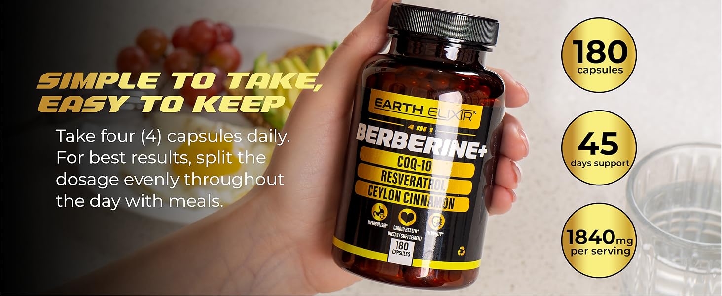 Earth Elixir 4-in-1 Berberine Supplement combines organic berberine (98% extract) with Ceylon cinnamon, CoQ10 ubiquinol (180mg), and resveratrol powder (380mg) in 180 vegan capsules. Designed to support metabolic health, cellular energy, and antioxidant protection, this clean, allergen-free formula is made in a GMP-certified US facility and third-party tested for quality.