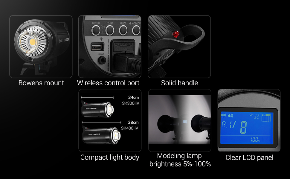 The Godox SK400II-V is a 400Ws studio strobe featuring a durable LED modeling lamp with adjustable brightness, a 2.4G wireless X system for remote control and sync, and an anti-preflash function for flawless camera compatibility. Its clear LCD panel offers precise power adjustments, while the Bowens mount ensures versatile accessory compatibility, making it ideal for professional e-commerce, portrait, and lifestyle photography setups.