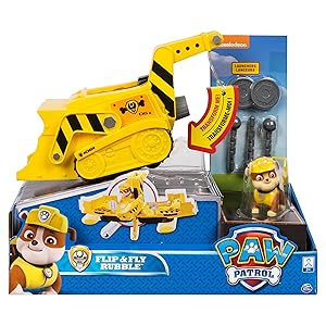 The Paw Patrol 6044472 Mission Paw Flip & Fly Vehicle Rubble is a 2-in-1 transforming toy that switches from bulldozer to jet, featuring built-in disc and wrecking ball launchers plus a rescue hook for airlifting pups. Designed for kids 3+, it encourages imaginative play and teamwork without the need for batteries or assembly.