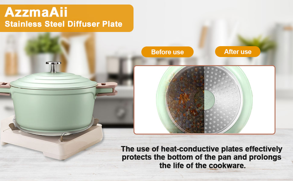 The AzzmaAii 22cm Heat Diffuser is a high-quality stainless steel cooking accessory designed to enhance your culinary experience. With its three-layer construction, it ensures quick and even heat distribution, making it perfect for various cooking methods. The removable handle adds convenience and safety, while its easy-to-clean surface maintains hygiene. Ideal for both home chefs and busy professionals, this heat diffuser is a must-have for any modern kitchen.