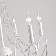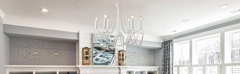 The Ganeed Chandelier is a stunning vintage-style light fixture featuring a rustic white finish and six adjustable lights. With a diameter of 66 cm and a height of 53 cm, it is designed for various ceiling types and is compatible with multiple bulb types, making it a versatile addition to any indoor space. Perfect for enhancing the ambiance of bedrooms, dining rooms, and more, this chandelier combines elegance with energy efficiency.
