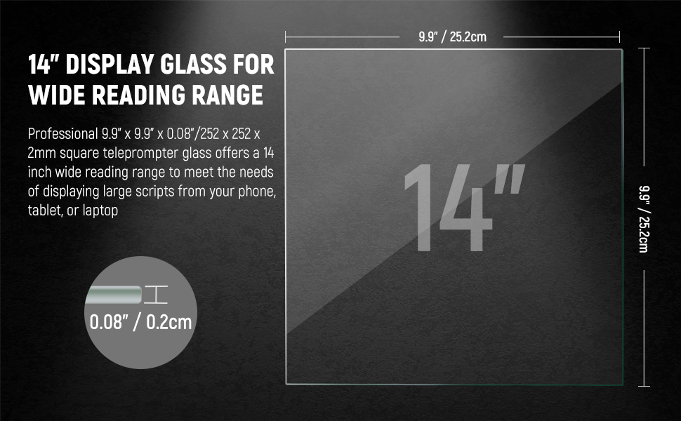 The NEEWER 14" Beam Splitter is a premium tempered glass designed for teleprompters, offering a perfect 70/30 reflection-to-transparency ratio that ensures crystal-clear, distortion-free images. Sized at 9.9"x9.9" with a 14-inch reading range, it features durable, scratch-resistant tempered glass with anti-reflective coatings to maintain true color fidelity. Ideal for DIY teleprompter builds or replacing broken glass, this professional-grade splitter enhances video productions, live events, and e-learning setups.