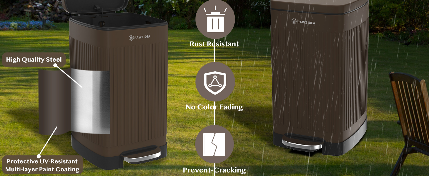 The PAWZIDEA Dog Poop Trash Can is a 5.3-gallon, heavy-duty outdoor waste bin designed for pet owners managing multiple large dogs. Featuring a rust-resistant metal body with UV and heat protection, it includes a replaceable activated carbon filter for superior odor control. The hands-free foot pedal and removable inner bucket make disposal hygienic and convenient, while its weatherproof coating ensures durability in all climates.