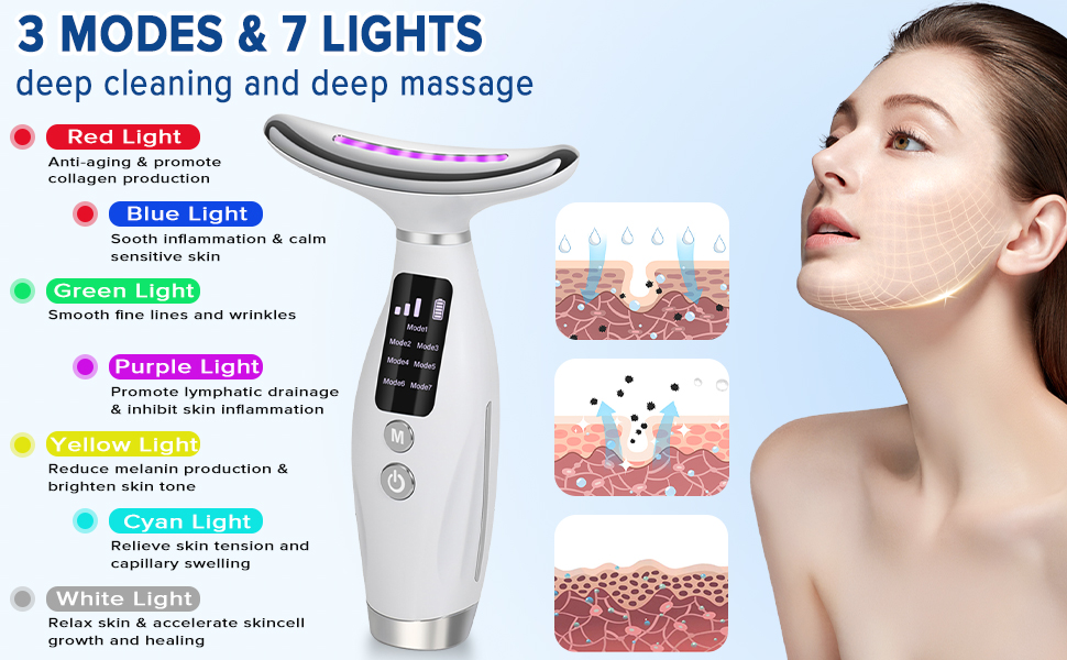 The Necomi Neck Face Massager is a multi-functional beauty device combining 7-color LED light therapy, EMS microcurrent massage with 10,000 vibrations per minute, and soothing heat at 45±5°C. Designed ergonomically with a dolphin tail-shaped head, it targets facial and neck skin to reduce wrinkles, promote collagen growth, and enhance skincare absorption, offering 4 intensity levels for a personalized anti-aging and firming experience.