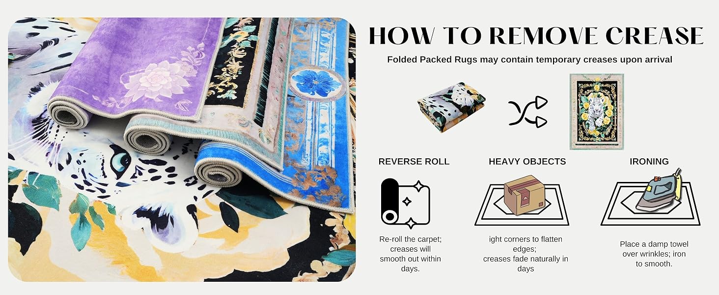 This was so pretty! The “ Living Room Rug 5x7 Rug Machine Washable Retro Lavish Leopard Area Rug Non Slip Floral Animal Vintage Low Pile Large Rugs for Living Room, Bedroom, Farmhouse, Dining Room, Kids Playroom” is a rug with a soft texture. It is a low profile rug, soft, and possibly a printed design? I can’t tell! It comes with plenty of care information to clean it. It was folded and within seconds of unfolding had no creases while laid out. It has a nice backing to make it not slip.Quality: No frayed edges, brilliant color, and very beautiful design! It’s not a neon pink nor a muted pink; it’s what you think of as pink. The panther is a nice contrast to the bright color and the flowers are so pretty. There’s no dull color to this that would allude to it fading. It isn’t thick.Overall: A happy wife is a happy life and my toddler seems to enjoy how smooth and soft it is. I really like the smaller 4x4 design, but we needed a full sized carpet for the play area/living room. The flowers brighten up our place and is a nice center piece. I like that it has no smell to it, uncreased very quickly, and is so smooth!