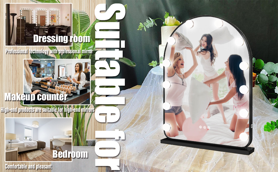 The Hollywood Arch Black Vanity Makeup Mirror features 12 dimmable LED bulbs with three adjustable color temperatures (3000-6000K), a detachable X10 magnifying mirror, and a versatile design that allows for both tabletop and wall mounting. Crafted with UL-certified materials, it offers customizable lighting and precision magnification to elevate your makeup routine, backed by a one-year warranty and responsive customer service.