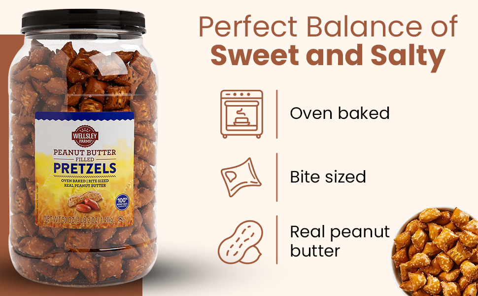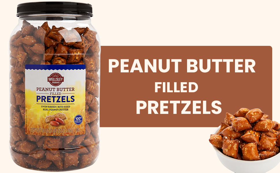 Wellsley Farms Peanut Butter Filled Pretzels deliver a satisfying blend of crunchy pretzel nuggets filled with real, creamy peanut butter. Packaged in a convenient 50 oz resealable jar, this kosher-certified snack is perfect for parties, on-the-go munching, or anytime you crave a delicious sweet and salty treat.