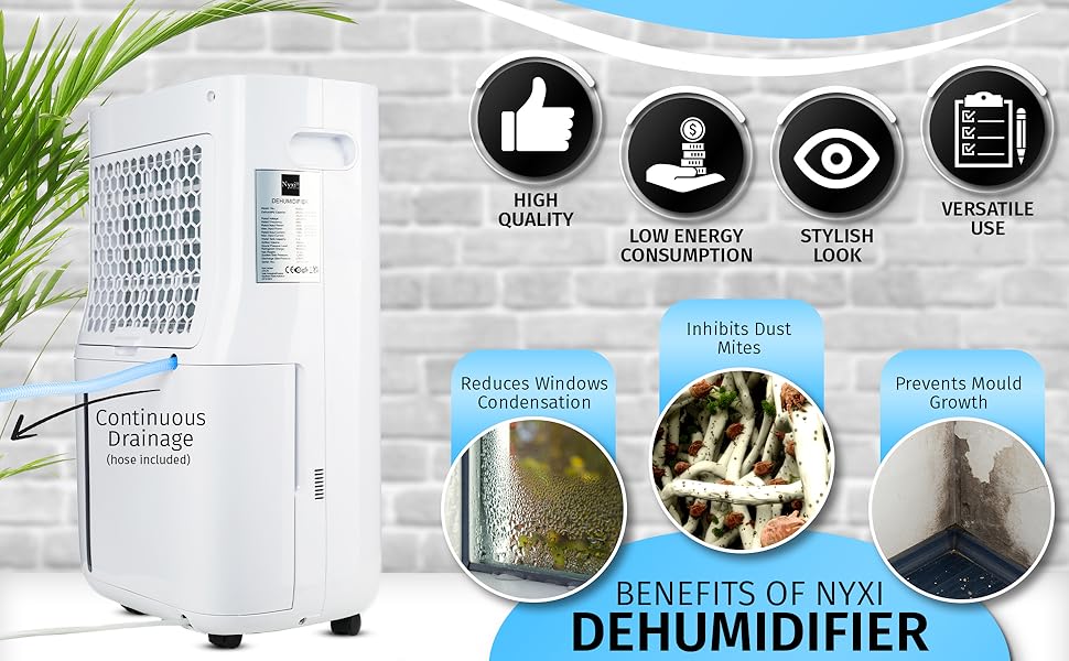 The Nyxi Home Dehumidifier efficiently removes up to 50 pints of moisture daily, covering spaces up to 4,500 sq.ft. Equipped with a large 1.7-gallon tank, automatic shutoff, and defrosting features, it ensures safe, continuous operation. Its digital touch controls, 24-hour timer, and humidity indicator provide precise environment management, while the washable filter and quiet design enhance comfort and air quality. Portable with castors and handle, it’s perfect for any home or office setting.